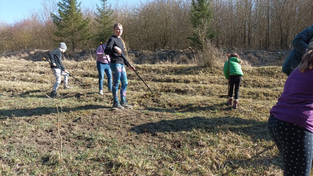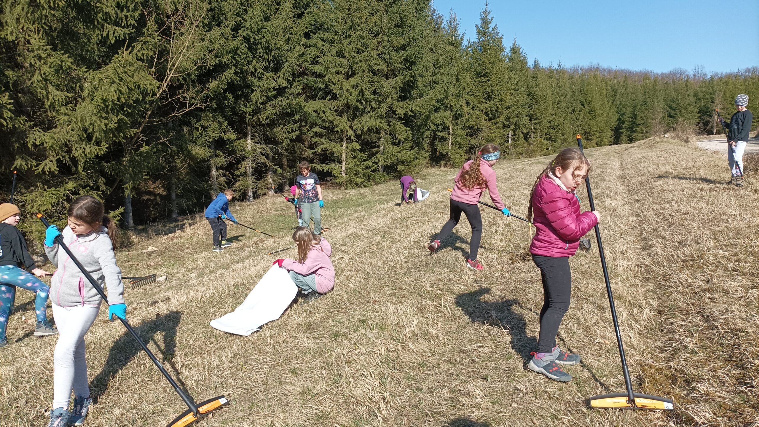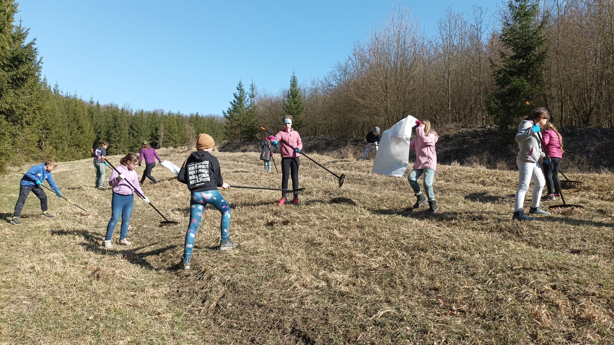 Pauzy jsme vyplnili trénováním otázek na soutěž Jičínský přírodovědec, která letos proběhne v Prachově 24.4. Jarní práce na louce jsou méně náročné, než podzimní (seč, hrabání a úklid trávy). Přesto jsme pod smrčky v lese za příkopem rozprostřeli 11 plných velkých pytlů biomasy.