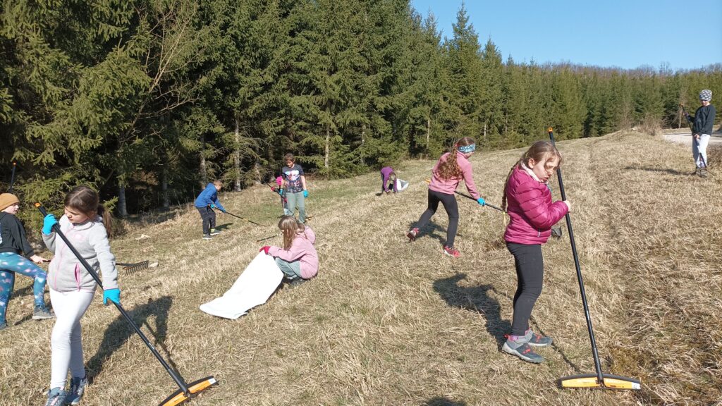 Na Hořečkové louce jsme se nejprve zastavili k občerstvení. Vypily se tři velké termosky čaje, snědla se čerstvá zelenina, nakrájená jablíčka i sušenky. Pak jsme se, plni nových sil, pustili do vyhrabávání mechu a stařiny, aby se v letošním roce hořečkům co nejlépe dařilo. Děti pracovaly s chutí a nadšením, a tak jsme zvládli se dvěma pauzami pohrabat celou plochu.