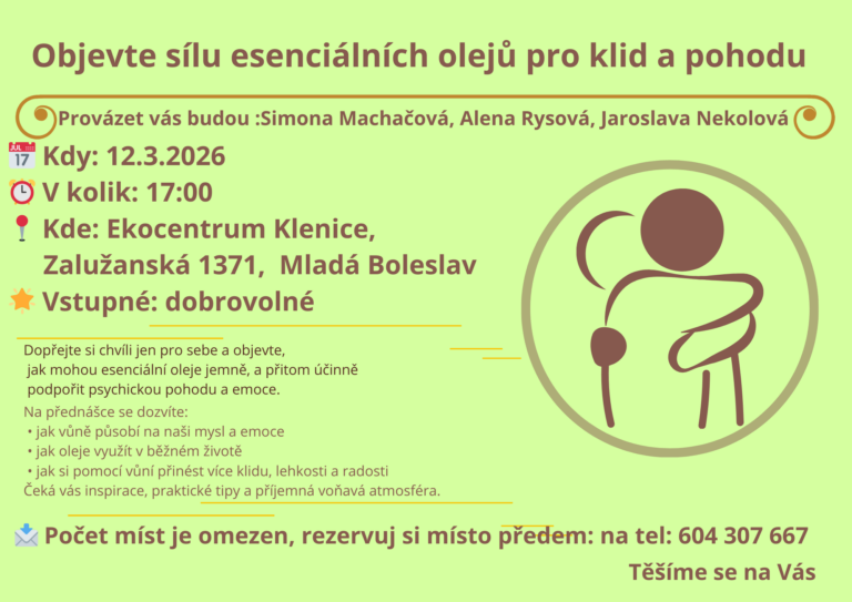 Provázet vás budou: Simona Machačová, Alena Rysová, Jaroslava Nekolová Dopřejte si chvíli jen pro sebe a objevte, jak mohou esenciální oleje jemně, a přitom účinně podpořit psychickou pohodu a emoce. Na přednášce se dozvíte: Čeká vás inspirace, praktické tipy a příjemná voňavá atmosféra. Počet míst je omezen, rezervuj si místo předem, na tel: 604 307 […]